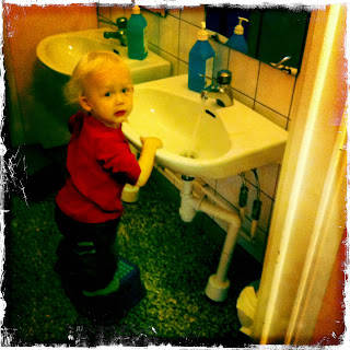 Vi började träffen med att fika, och fortsatte sedan ut på gården där det lektes för fulla muggar. Isac ville inte sova middag men höll sig vid gott mot ändå. Först när de hade åkt hem somnade han, i vagnen i upprätt läge. Så fort jag försökte på mig på att fälla ryggstödet vaknade han ilsk som ett bi.