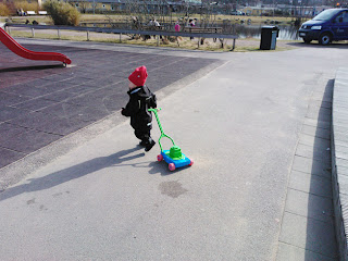Isac i sin tur blev helt kär i en liten gräsklippare som han hittade på lekplatsen. Som tur var fick han låna den av ett annat barn. Han älskade den! Han blev helt skogstokig när vi skulle gå därifrån och han var tvungen att lämna den ifrån sig.