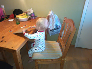 Isac kände för att pussla lite förut. Pusslet låg så fint bredvid det gröna vattenglaset bredvid fruktskålen. Varför inte sätta sig på stolen och pussla lite då? Söting!