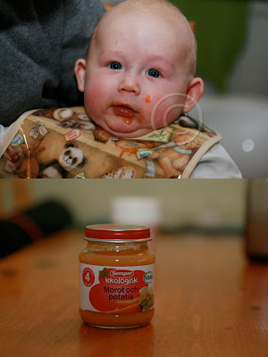 Jodå, idag fick Isac smaka på en tesked puré gjord på potatis och morot. Fyra månader som han blir idag. Först fattade han inte vad han skulle göra med det, han såg inte chockad ut, utan hade mest bara en min av förvåning. Lite åkte ut ur munnen igen. Efter ett par vändor svalde han lite grann, fortfarande utan den av mig förväntade äckelkänslan. Mikael tror att den kommer i morgon. Det blir intressant att se.