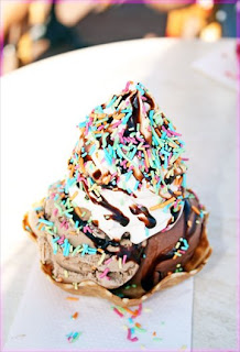 Vanligtvis brukar jag ta en bägare med två eller tre kulor, beroende på hur sugen jag är på glass. Men den här gången valde jag att prova Mikaels nya favorit, Triumfsnäckan. Jag blev inte besviken! Två kulor valfri glass toppad med en rejäl klick mjukglass, topping och strössel i en snäcka av rån (hur säger man?). Mums!