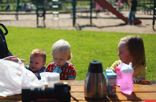 Efter besöket hos djuren slog vi oss ner på gräsmattan bredvid den fina lekplatsen i Nolhagaparken. Där dukade vi upp fika och barnen fick springa runt och leka. Alla tre hade väldigt roligt. Själv satt jag och njöt av medhavt kaffe och bullar. Isac roade sig kungligt på lekplatsen och med Nathalies boll.