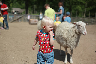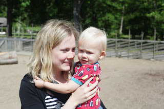 Idag packade vi in oss i bilen och åkte till Alingsås, och Nolhaga. Där mötte vi som sagt upp Lorelai med familj. Vi började med att gå in och klappa djuren. Det var en inhägnad med en sluss, och medan vi gullade med djuren lyckades Isac smita med några människor ut ur inhägnaden, genom slussen och ut på gården utanför. Han är en riktig smitare, den lille mannen. Vi såg honom när han precis lyckats ta sig ut som tur var. (Note to self: håll koll på Isac.) Jag bad Mikael ta en bild på mig medan jag klappade ett lamm, och när jag sträckte ner handen mot ett av dem hade jag plötsligt ett flertal får och lamm runt mig. Keliga typer det där.